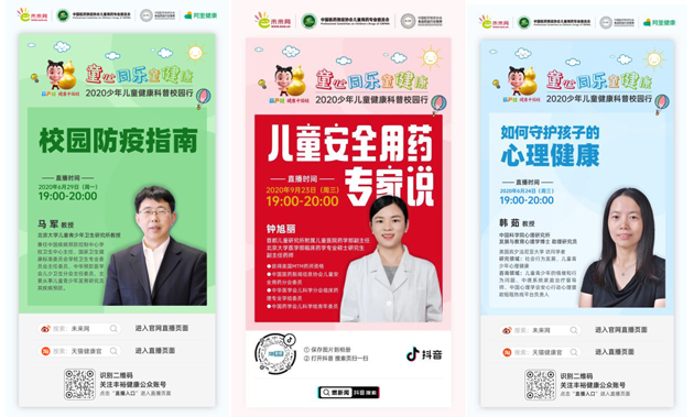 公開課邀請(qǐng)到中國(guó)科學(xué)院心理研究所發(fā)展與教育心理學(xué)博士、助理研究員韓茹,北京大學(xué)兒童青少年衛(wèi)生研究所所長(zhǎng)馬軍,首都保健營(yíng)養(yǎng)美食學(xué)會(huì)會(huì)長(zhǎng)、ISF健康學(xué)院院長(zhǎng)王旭峰,首都兒科研究所附屬兒童醫(yī)院藥學(xué)部副主任鐘旭麗,ISF特聘高級(jí)營(yíng)養(yǎng)講師、首都保健營(yíng)養(yǎng)美食學(xué)會(huì)任副秘書長(zhǎng)李潤(rùn)庭分別就兒童心理健康、校園防疫、兒童營(yíng)養(yǎng)健康、兒童用藥健康以及兒童腸胃健康話題進(jìn)行直播授課。公開課在阿里健康、抖音、一直播、淘寶直播平臺(tái)進(jìn)行直播,在線實(shí)時(shí)觀看直播人數(shù)達(dá)40多萬(wàn),通過(guò)未來(lái)網(wǎng)活動(dòng)專區(qū)、官方微博等觀看專題短視頻流量達(dá)到200多萬(wàn)人次。▲兒童健康網(wǎng)絡(luò)科普公開課