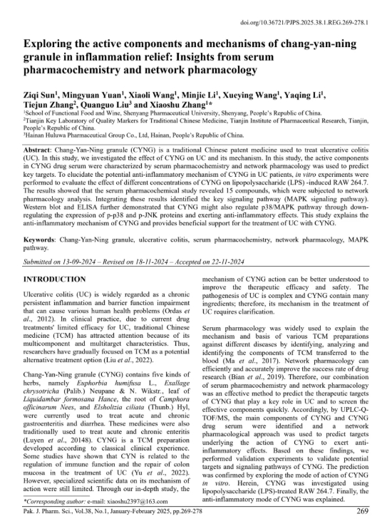 此次發(fā)表的文章題為《腸炎寧顆粒緩解炎癥的物質(zhì)基礎(chǔ)和藥理機制:血清藥理學(xué)與網(wǎng)絡(luò)藥理學(xué)綜合研究》,刊登于巴基斯坦制藥科學(xué)雜志(Pak. J. Pharm. Sci.)。該研究深入探討了腸炎寧顆粒(CYNG)在治療潰瘍性結(jié)腸炎(UC)中的作用機制,通過血清藥理學(xué)和網(wǎng)絡(luò)藥理學(xué)的綜合方法,揭示了其抗炎活性成分及關(guān)鍵信號通路,為腸炎寧顆粒的臨床應(yīng)用提供了堅實的科學(xué)依據(jù)。